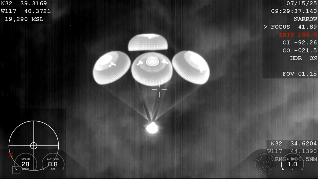 15 lipca po godzinie 11 polskiego czasu, kapsuła zaczęła wchodzić w ziemską atmosferę z prędkością około 27 000 km/h! Z tego powodu osłona termiczna na spodzie Dragona rozgrzała się do temperatury około 1600*C i przez około 6 minut kontrolerzy z Ziemi stracili kontakt z załogą – co jest standardowym etapem powrotu na naszą planetę. Astronauci w środku kapsuły odczuwali tam przeciążenie nawet 4G, czyli czuli się 4 razy ciężsi niż na Ziemi. Po chwili otworzyły się dwa spadochrony stabilizujące, a następnie cztery główne i tak jak zakładano, misja Ax-4 zakończyła się wodowaniem o godzinie 11:31. Kapsuła została szybko odebrana przez statek MV Shannon należący do SpaceX. Następnie cała załoga po kolei wyszła z Dragona i postawiła swoje pierwsze kroki po powrocie z orbity.